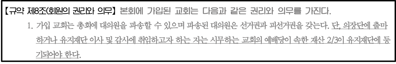 특히 규약 제8조 1항은 의장단에 출마할 후보자는 시무(담임)하는 교회의 재산 2/3가 유지재단에 등기되어야 한다고 명시하고 있습니다.