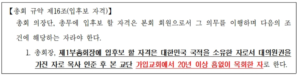 2012년까지 총회장 후보는 「침례 받은 지 20년이 넘은 자」이어야 한다는 규정이 있었다. 그런데 「침례 받은 지 ‘18년’ 밖에 안 된」 자가 총회장 후보가 됐고, 당선도 됐다.