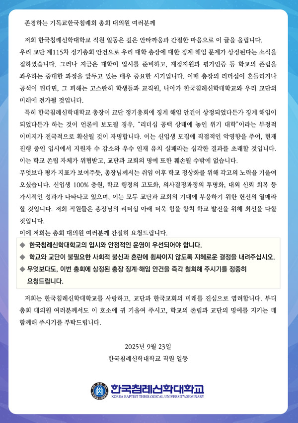 이메일 기사저장 공유 저작권자 © 뱁티스트투데이 무단전재 및 재배포 금지 광고문의 댓글삭제 삭제한 댓글은 다시 복구할 수 없습니다. 그래도 삭제하시겠습니까? 비밀번호 닫기 기사 댓글 0 댓글 접기 댓글입력 권한이 없습니다. 댓글 내용입력 비회원 로그인 이름 비밀번호 댓글 내용입력 댓글쓰기 계정을 선택하시면 로그인·계정인증을 통해 댓글을 남기실 수 있습니다. 회원 로그인 이름 비밀번호 자동등록방지 로그인 옵션 창닫기