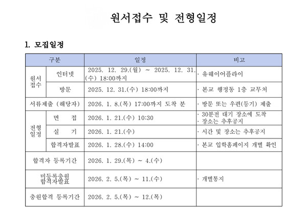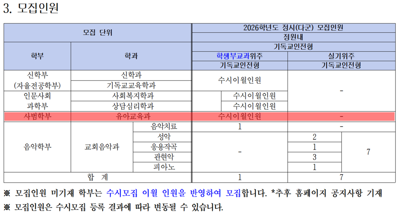 한국침례신학대학교 2026학년도 유아교육과 신입생 모집 안내입니다. 전형일정은 아래와 같이 진행됩니다.