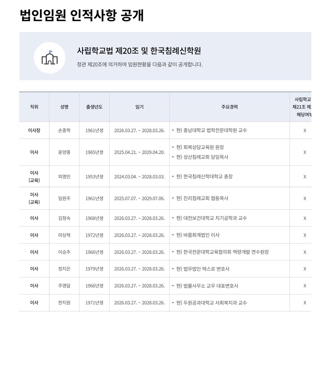 또한 향후 운영 방향에 대해 “침례교단의 신앙심 깊은 목사님들이 정이사로 선임되어 학교를 더욱 발전시켜 나갈 수 있도록 징검다리 역할을 충실히 수행하겠다”며, 임시이사 체제를 조속히 마무리하고 건실한 정이사 체제로 전환하겠다는 강력한 의지를 표명했다.